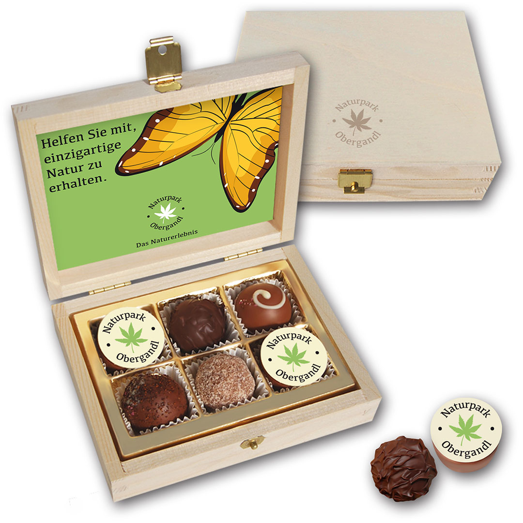 Individuell | Druckbereich Schokolade, Laserung Holzkiste, Druckbereich Karte |