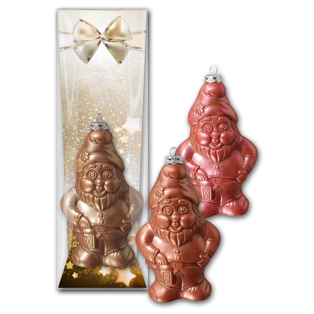Aus zartschmelzender Edelschokolade der Marke Dostler von Hand geschöpft. Die Schokolade wird mit lebensmittelechtem Metallglanz abgepudert und mit Aufhänger versehen.