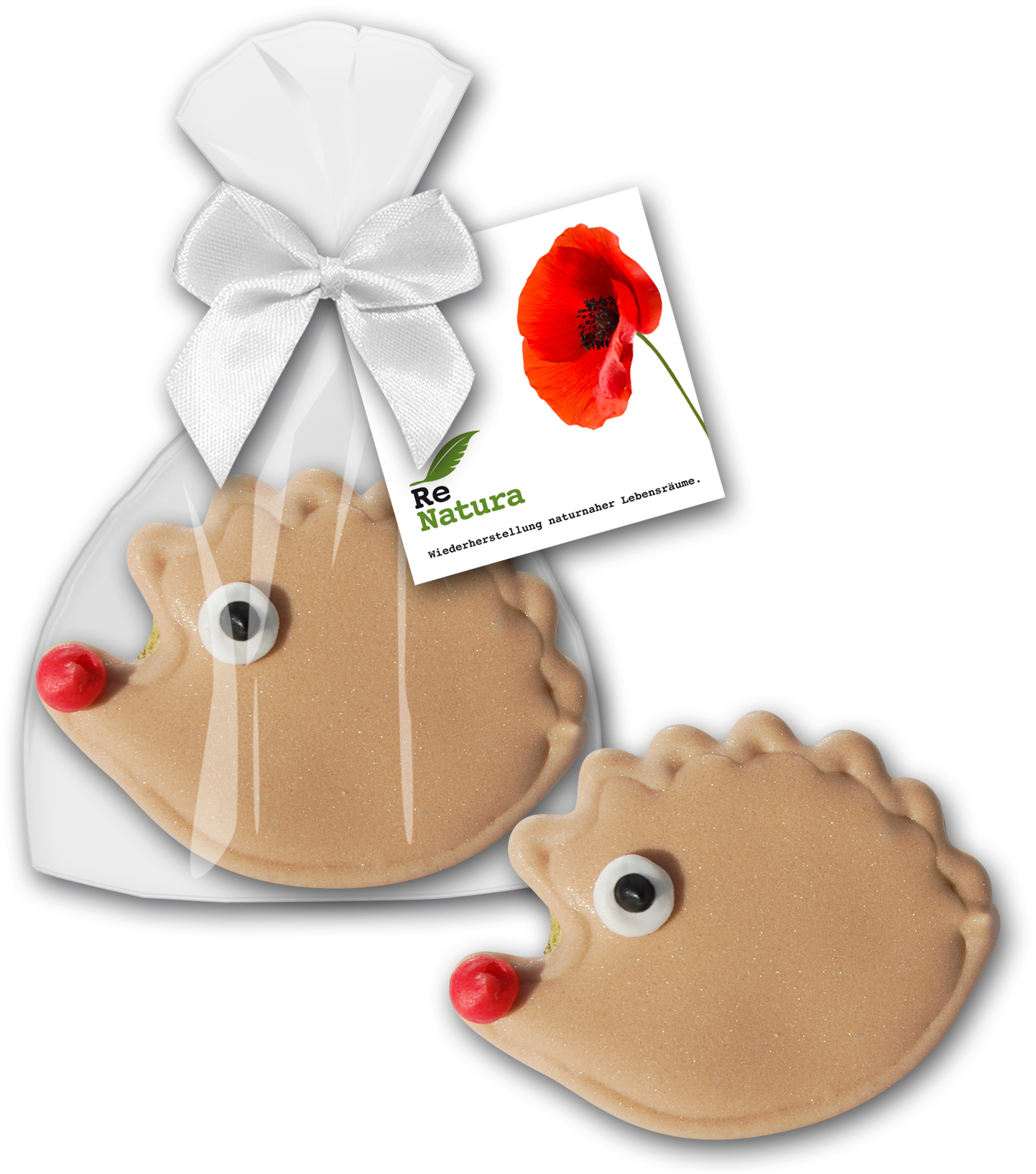 Verpackung | In Glanzbeutel mit weißer Satinschleife und bedruckter Karte aufgebunden. |