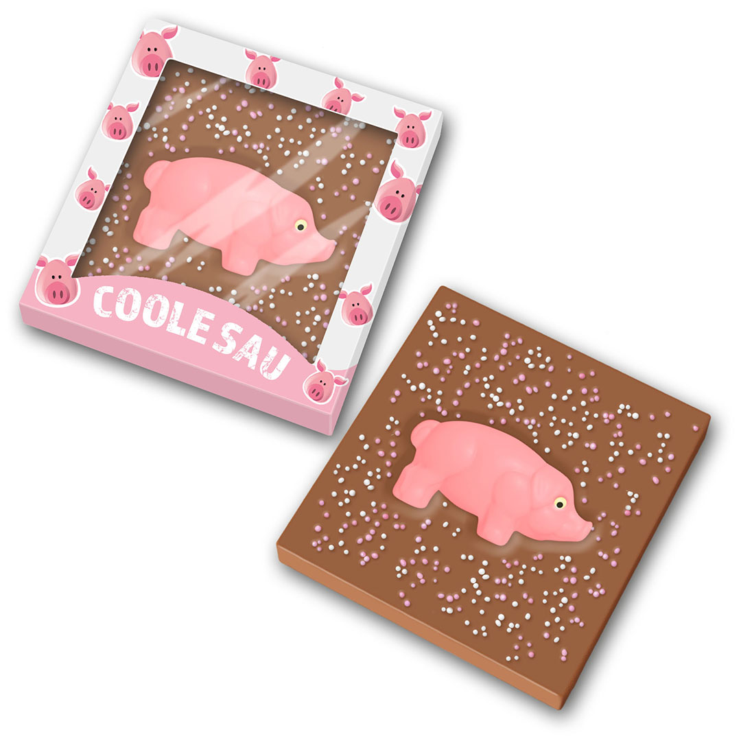 Feinste, handgeschöpfte Edelschokolade der Marke Dostler, mit dem unvergleichlich zarten Schmelz. In die Schokolade werden Schokofiguren und Zuckerperlen eingestreut.