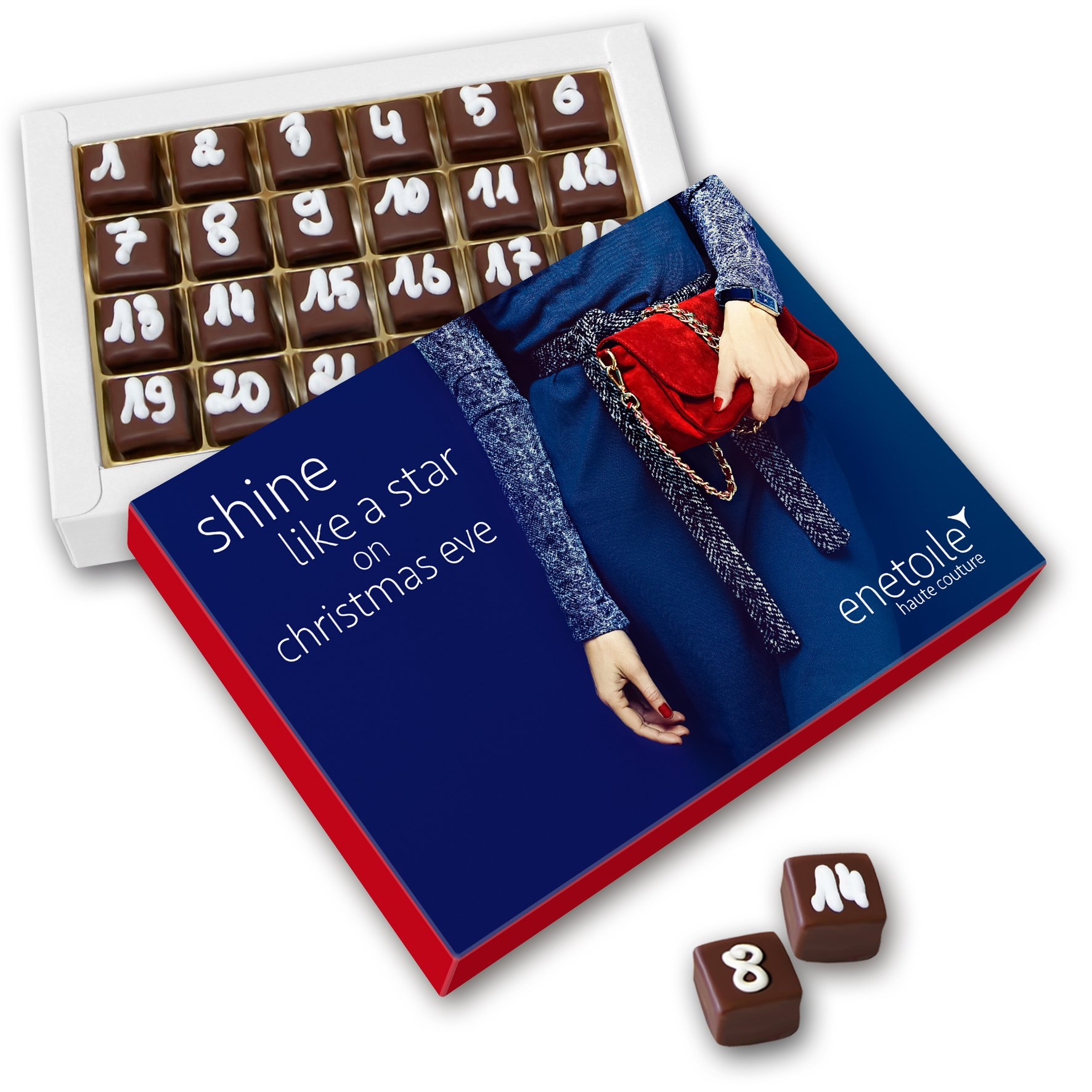 Dreifach gefüllt und mit feinster Edel- Zartbitterschokolade überzogen und von Hand beschriftet.