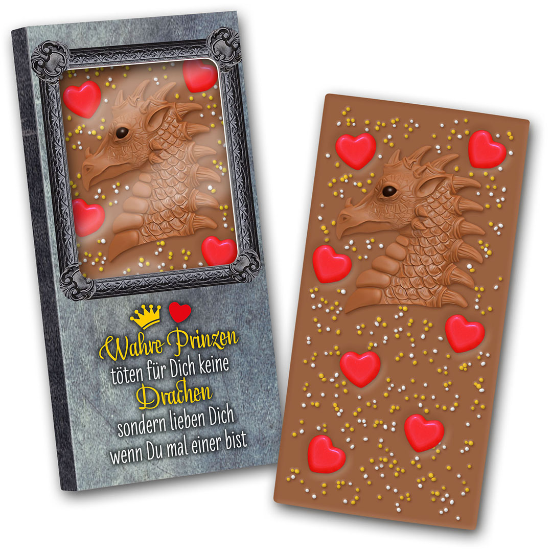 Feinste, handgeschöpfte Edelschokolade der Marke Dostler, mit dem unvergleichlich zarten Schmelz. In die Schokolade sind Schokoladenfiguren und Zuckerperlen eingestreut.
