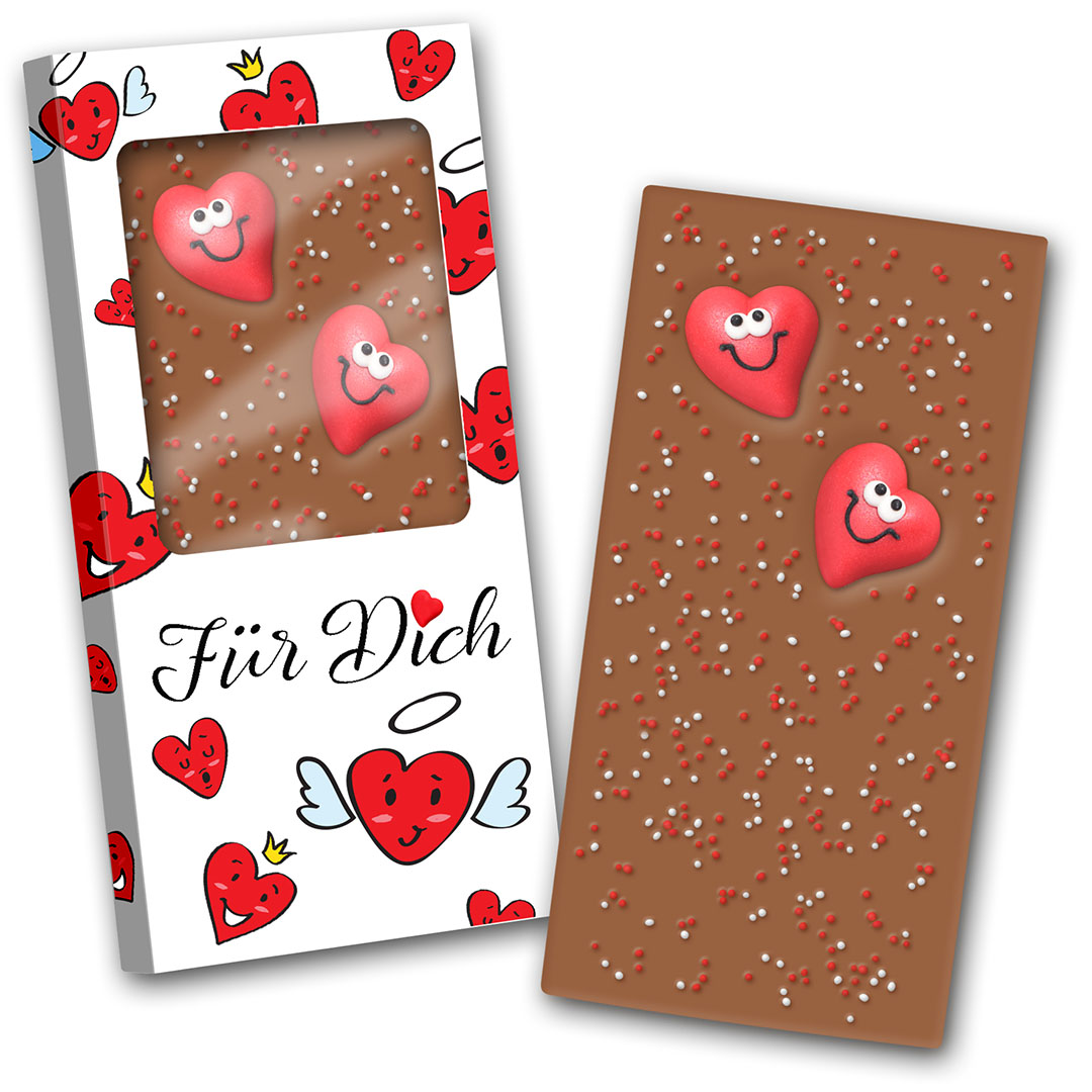 Feinste, handgeschöpfte Edelschokolade der Marke Dostler, mit dem unvergleichlich zarten Schmelz. In die Schokolade sind Schokoladenfiguren und Zuckerperlen eingestreut.