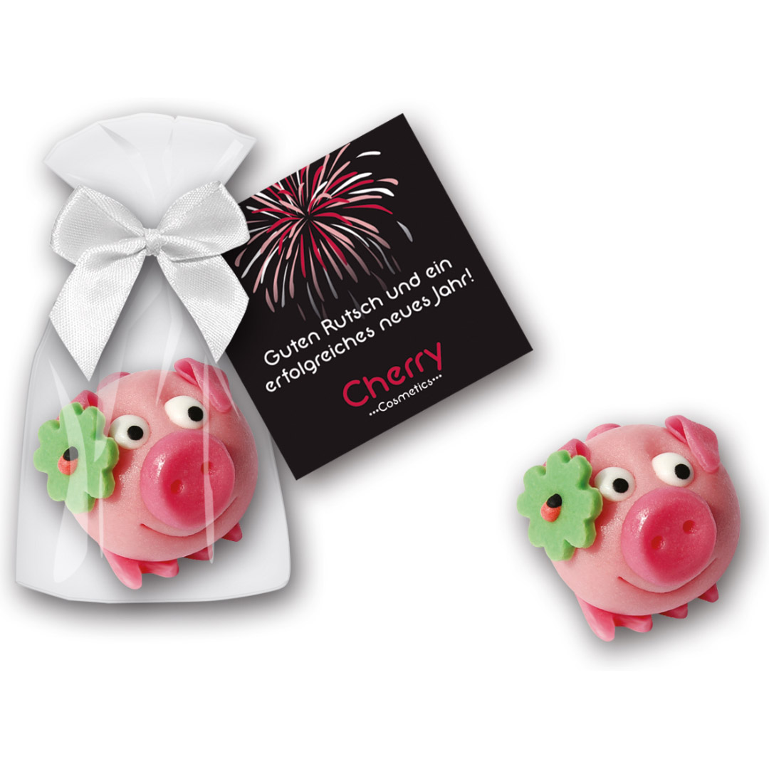 | Verpackung | In Glanzbeutel mit bedruckter Karte und weißer Satinschleife verpackt. |