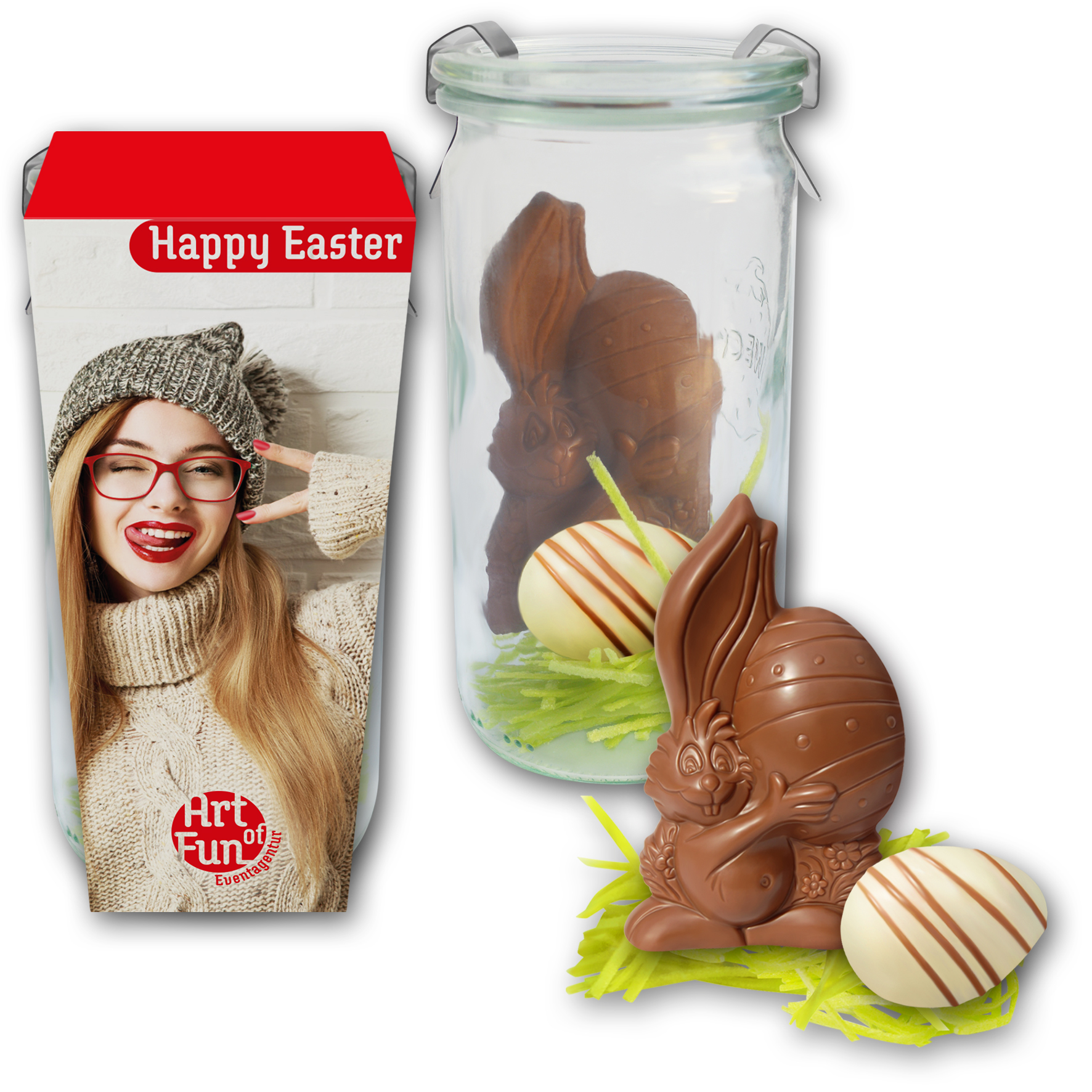 Feinstes Trüffelei und Schokoladenfigur der Marke Dostler, mit dem unvergleichlich zarten Schmelz. In trendiges Weckglas gefüllt.