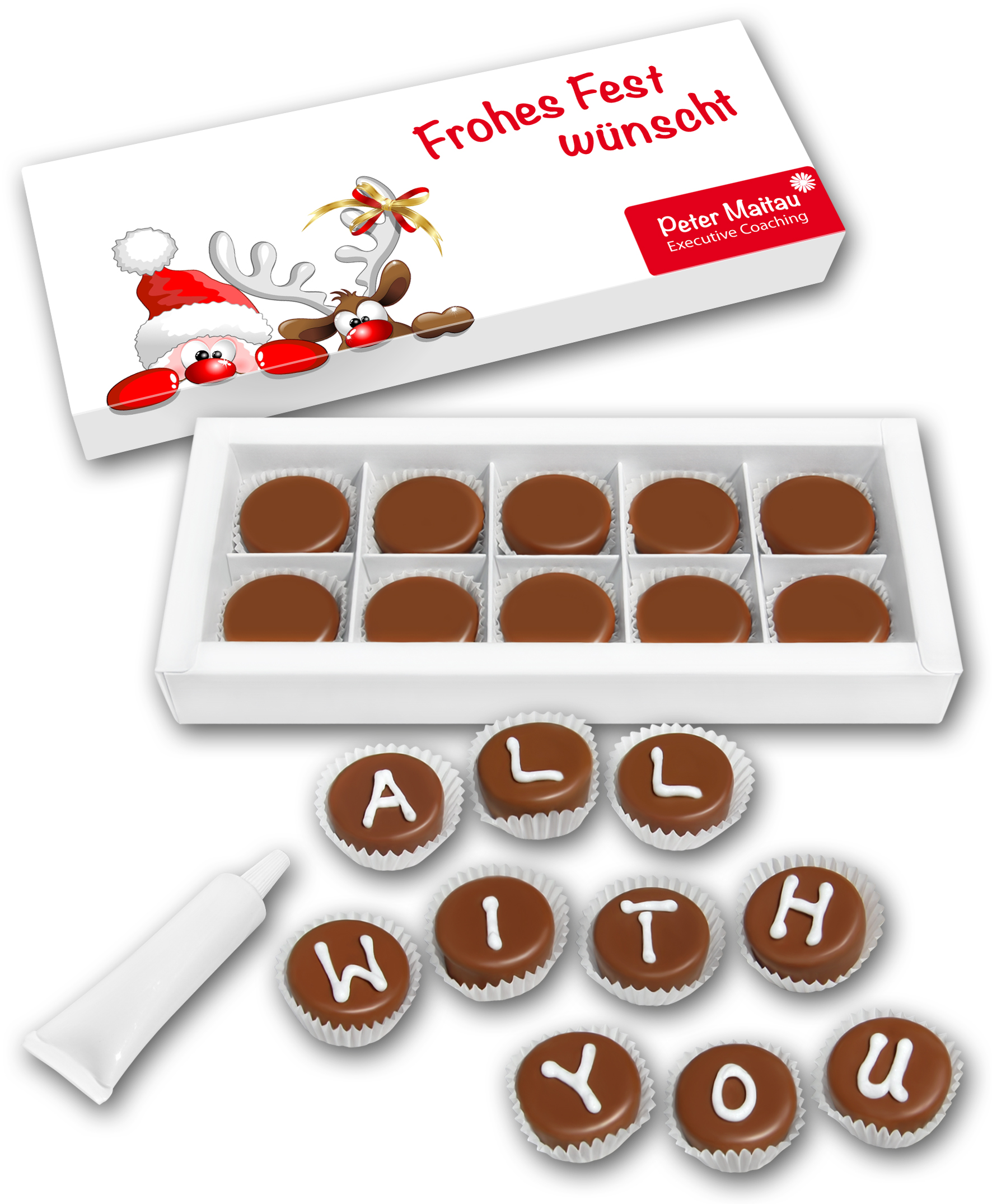 Befüllt mit gemischten, exklusiven Trüffeltöpfchen ohne Alkohol der Marke Dostler, mit dem unvergleichlich zarten Schmelz. Mit Bastelzuckertube zum Beschriften.