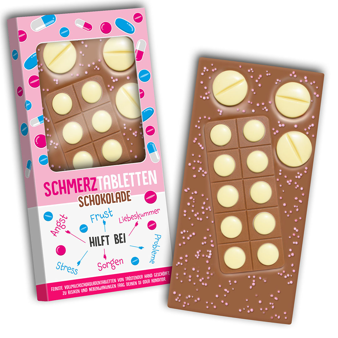 Feinste, handgeschöpfte Edelschokolade der Marke Dostler, mit dem unvergleichlich zarten Schmelz. In die Schokolade sind Schokoladenfiguren und Zuckerperlen eingestreut.