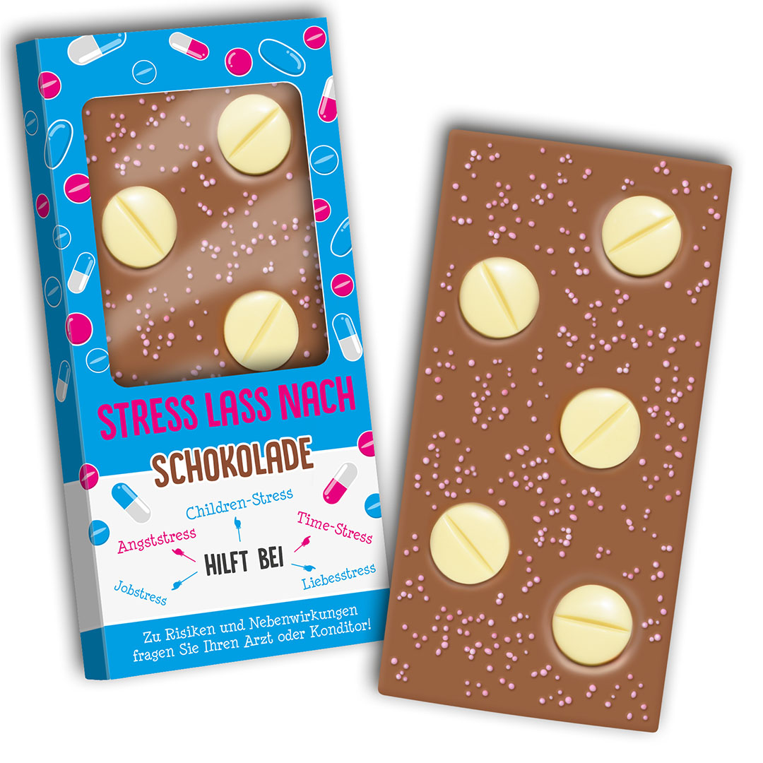 Feinste, handgeschöpfte Edelschokolade der Marke Dostler, mit dem unvergleichlich zarten Schmelz. In die Schokolade sind Schokoladenfiguren und Zuckerperlen eingestreut.