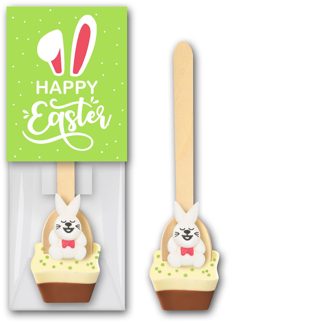 Feinste, handgeschöpfte Edelvollmilchschokolade der Marke Dostler, mit dem unvergleichlich zarten Schmelz. Mit bunten Zuckerperlen und Zuckergusshase verziert.