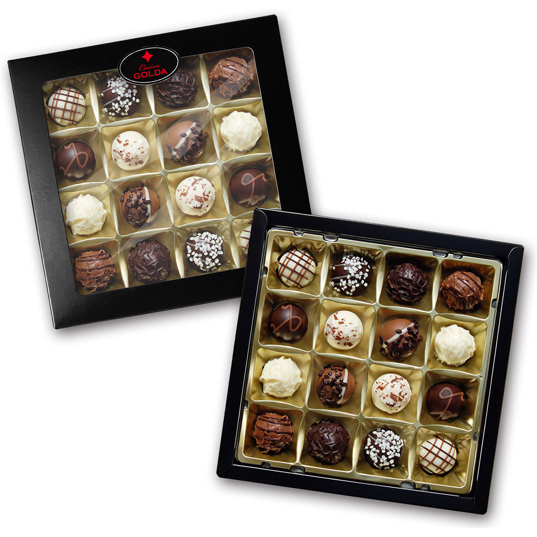 Befüllt mit exklusiven Trüffeln ohne Alkohol der Marke Dostler, mit dem unvergleichlich zarten Schmelz.