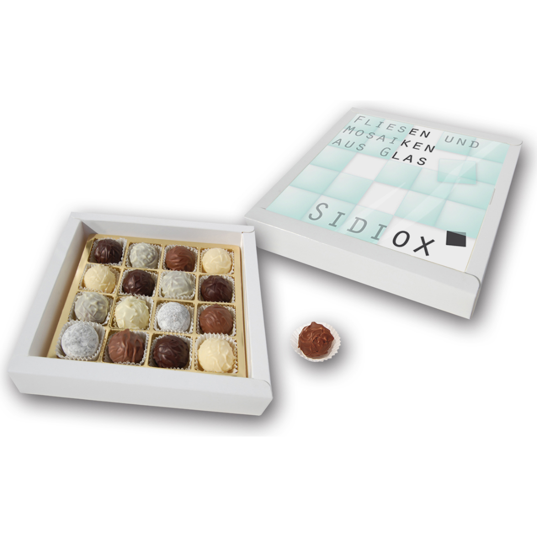 Befüllt mit gemischten, exklusiven Trüffeln ohne Alkohol der Marke Dostler, mit dem unvergleichlich zarten Schmelz.