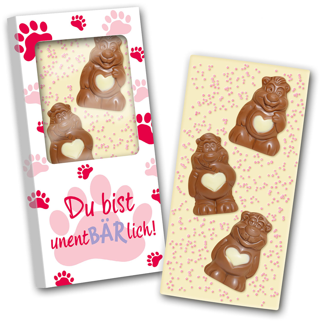 Feinste, handgeschöpfte Edelschokolade der Marke Dostler, mit dem unvergleichlich zarten Schmelz. In die Schokolade sind Schokoladenfiguren und Zuckerperlen eingestreut.