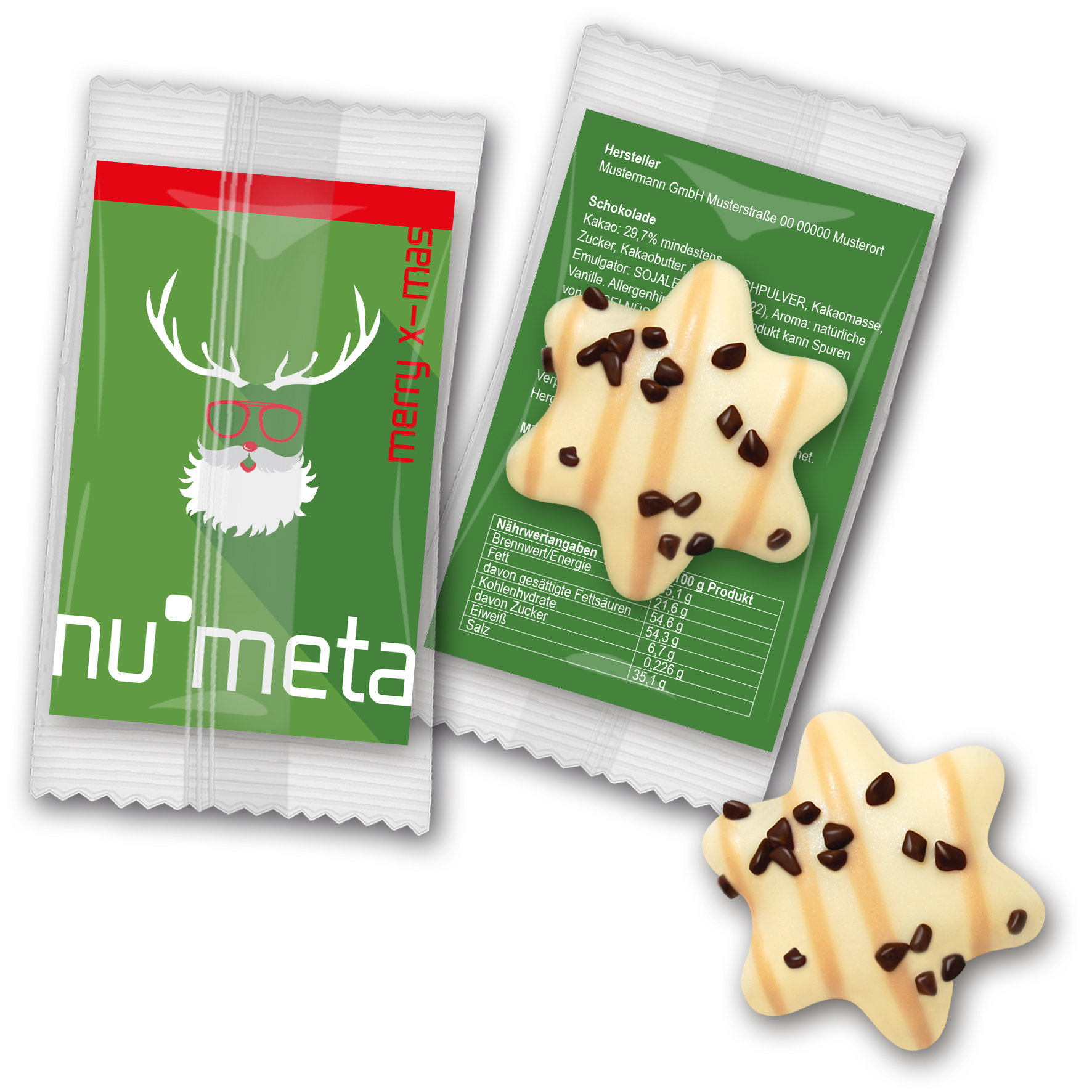 Praline (Zucker, SAHNE (32% Fett), Kakaobutter, Glukosesirup, VOLLMILCHPULVER; Kakaomasse, HASELNÜSSE (2,4%), Karamellzuckersirup, SAHNEPULVER, Emulgator: SOJALECITHIN; Säuerungsmittel: Citronensäure; Aroma: natürliches Vanillearoma, Vanillin, natürliche Aromastoffe, Aromaextrakte); essbares Papier (Wasser, Maisstärke, Zucker, Kakaobutter, Bambusfaser, Glukosesirup, Emulgator: E322, E472a; Vanille).